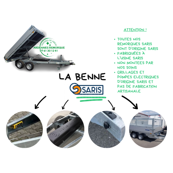 Remorque benne Saris black Edition , reconnue pour sa qualité exceptionnelle et sa fiabilité. Équipée d’une pompe électrique, avec tous les éléments d’origine Saris (pompe, carter, télécommande) pour une performance optimale.